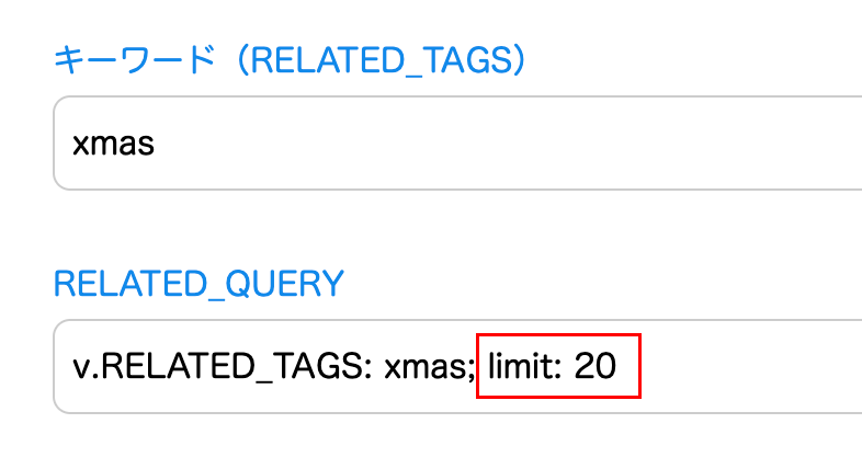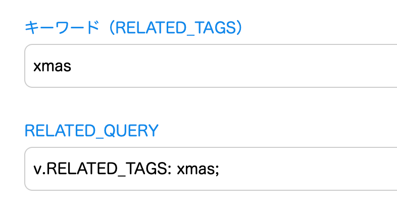 で指定したい場合、キーワード入力用の項目(RELATED_TAGS)と、キーワード指定用の項目(RELATED_QUERY)を作って入力します。