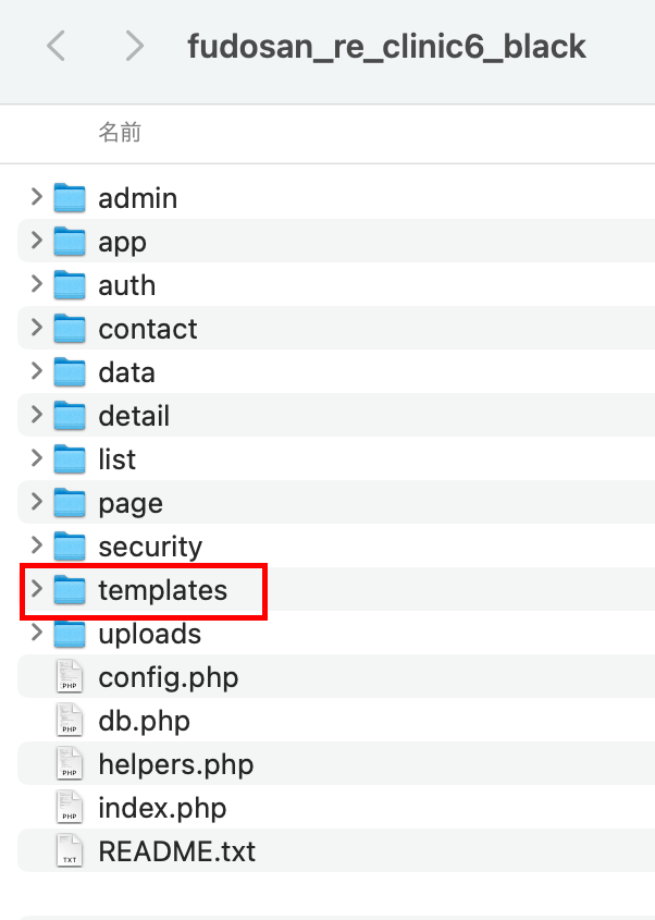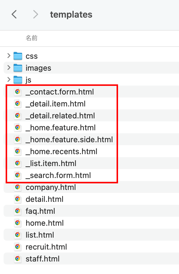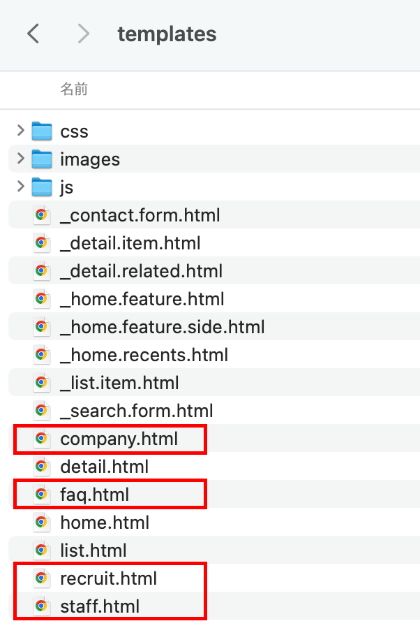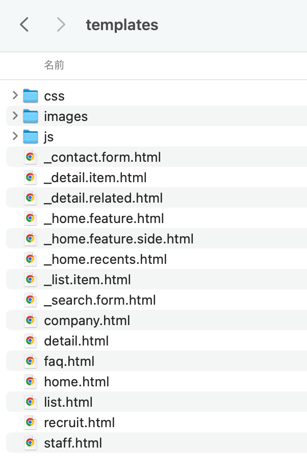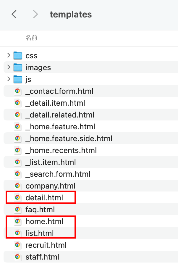 home.html、list.html、detail.htmlがテンプレートの骨格ファイルで必須です。