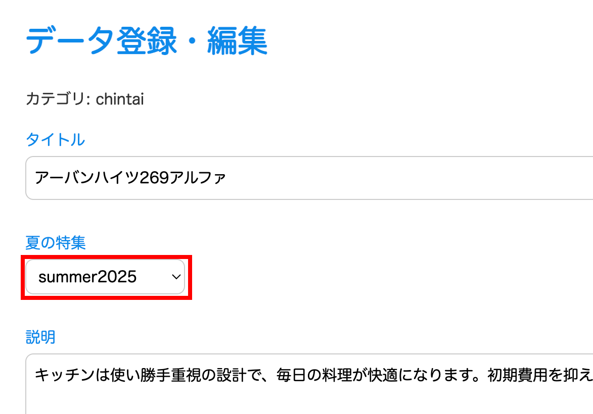 今回は前の特集と同じ「賃貸物件」の編集ボタンをクリックします。
