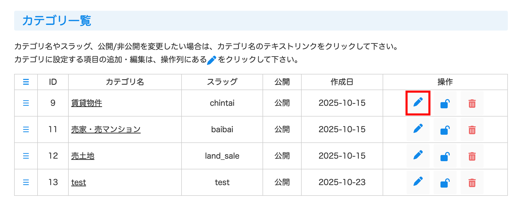 「カテゴリ設定」を開き、デモ版で特集を組んでいた「賃貸物件」の編集ボタンをクリックします。