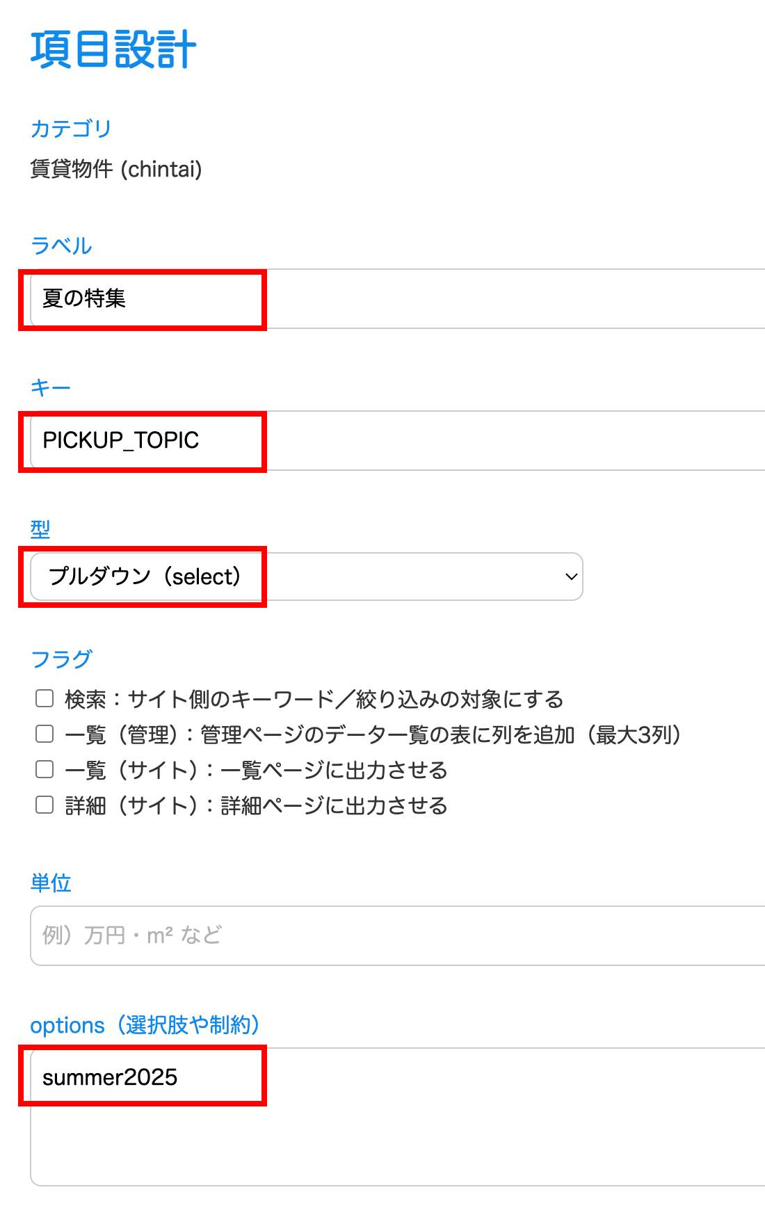 optionsには、最初に「NEW/UPアイコン・特集の設定」ページで入力した「特集コード(summer2025)」を入力します。
