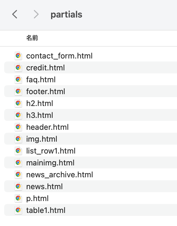 - partialsフォルダ … index.htmlとpage.htmlのプレースホルダーで実際に使うhtmlや、管理画面のパーツプルダウン用のhtmlが入っています。