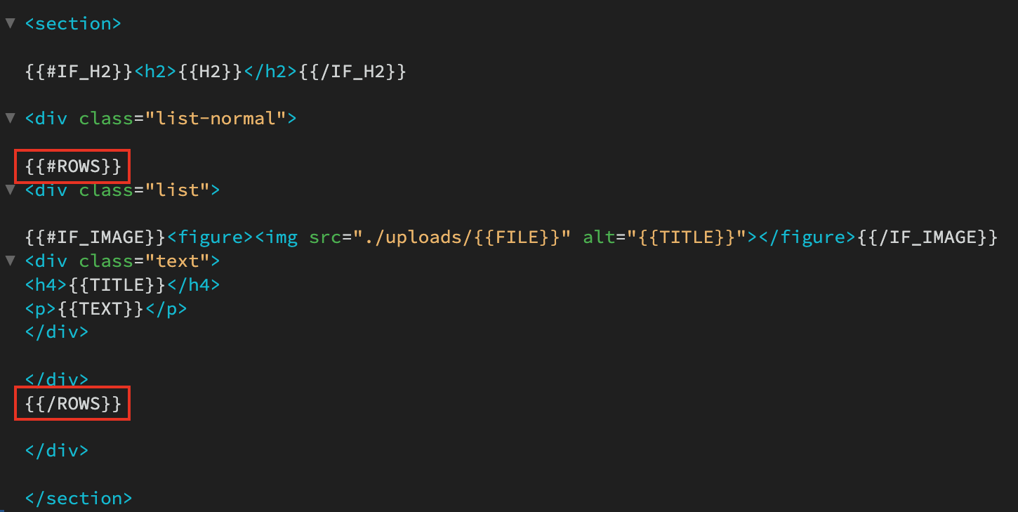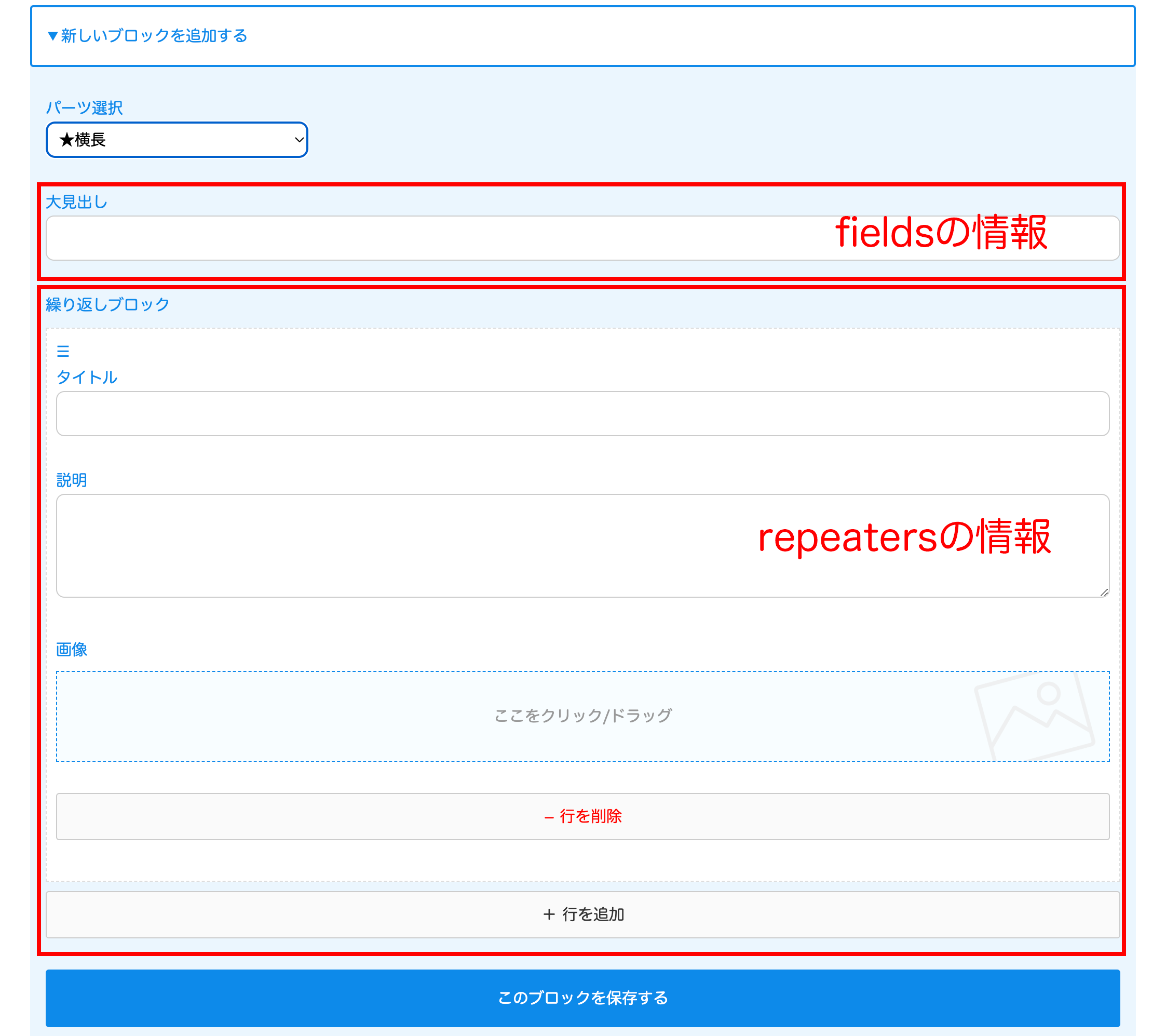 - 一番最後の、imgの行は、htmlタグです。管理画面で入力したデータがここに出力されます。今回は画像だったので、.uploads/とフォルダを参照して、keyを指定しています。
