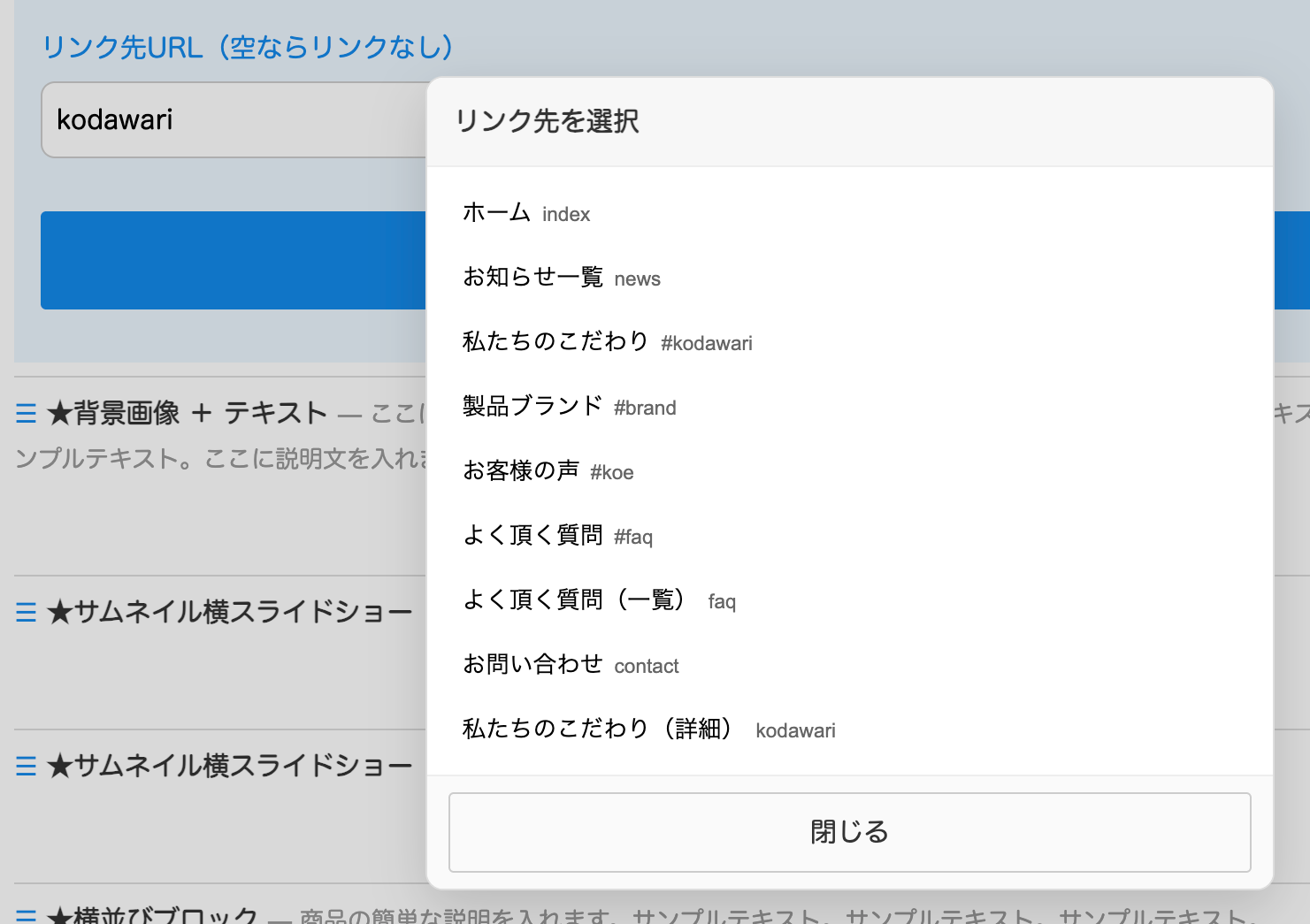 上の青いリンクアイコンをクリックすると、メニュー設定で設定しているリスト(↓)が出てくるのでクリック選択して下さい。