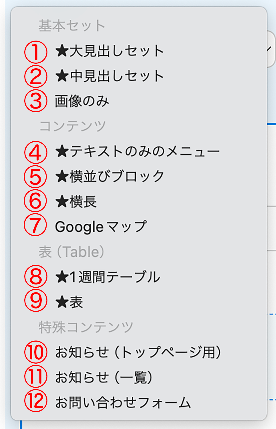 管理ページの「ページ編集」で選べるパーツ一覧です。テンプレートにより、使えるパーツは異なります。