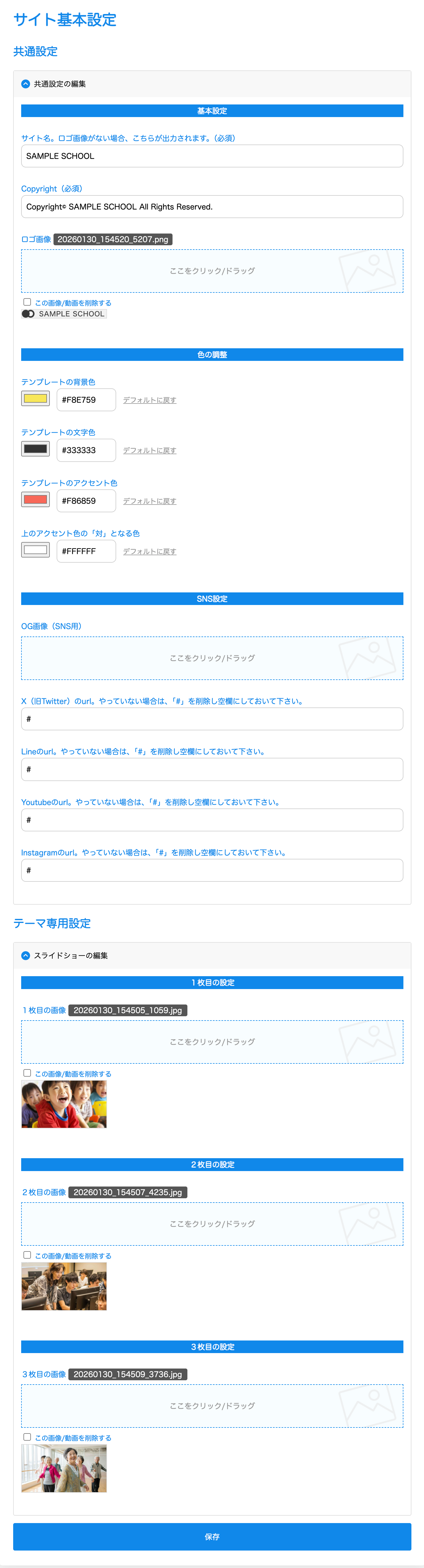 ↓「サイト基本設定」ページです。ロゴやメイン画像はここで設定します。
