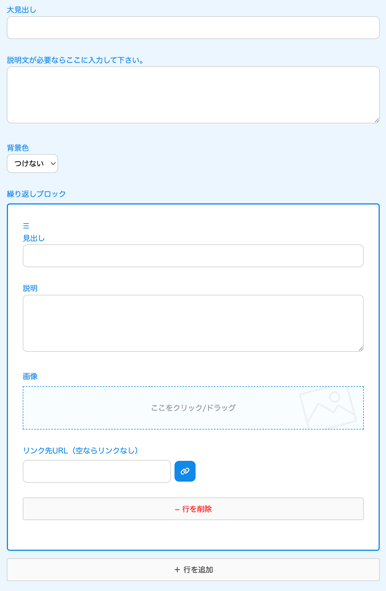 ↓自動で出てくる入力フォーム。こちらも見出しのみです。お知らせ全件が出力されます。