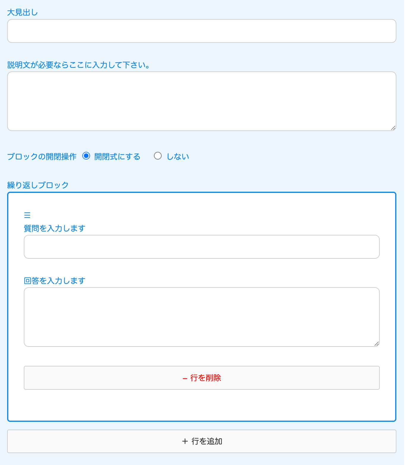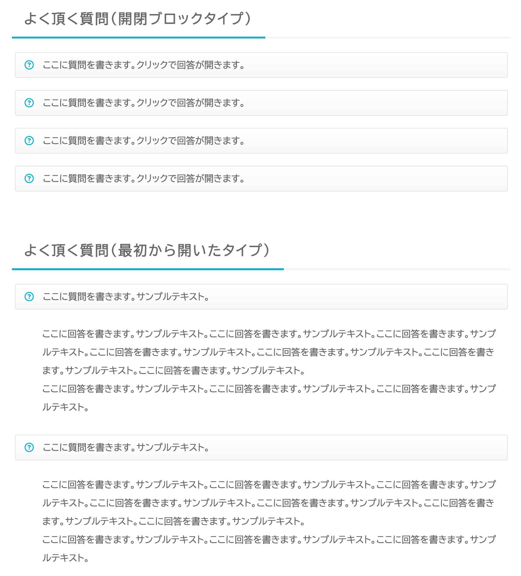 「ブロックの開閉操作」の設定を「開閉式にする」にした場合、ここの質問をクリックする事で回答が開きます。