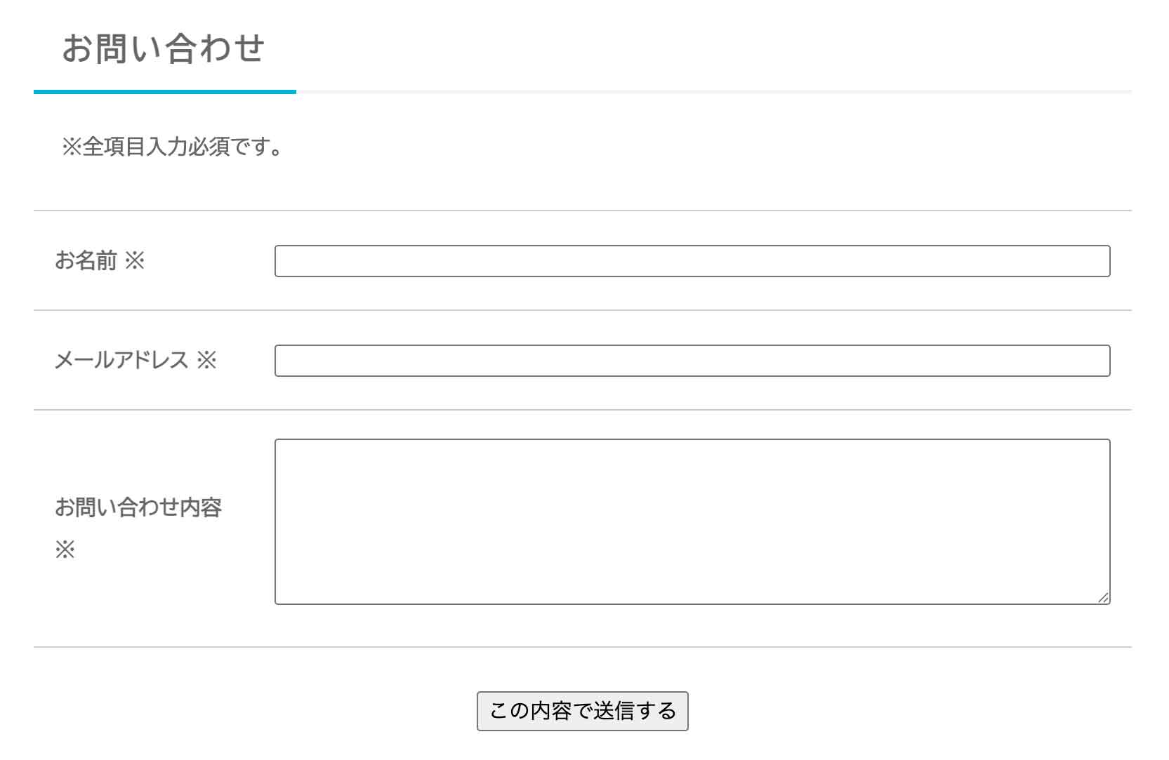 ↓出力例。フォームの設定は、管理ページの「フォーム設定」で行います。フォームのカスタマイズも可能。