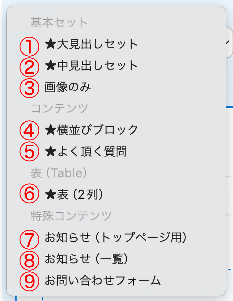 管理ページの「ページ編集」で選べるパーツ一覧です。テンプレートにより、使えるパーツは異なります。