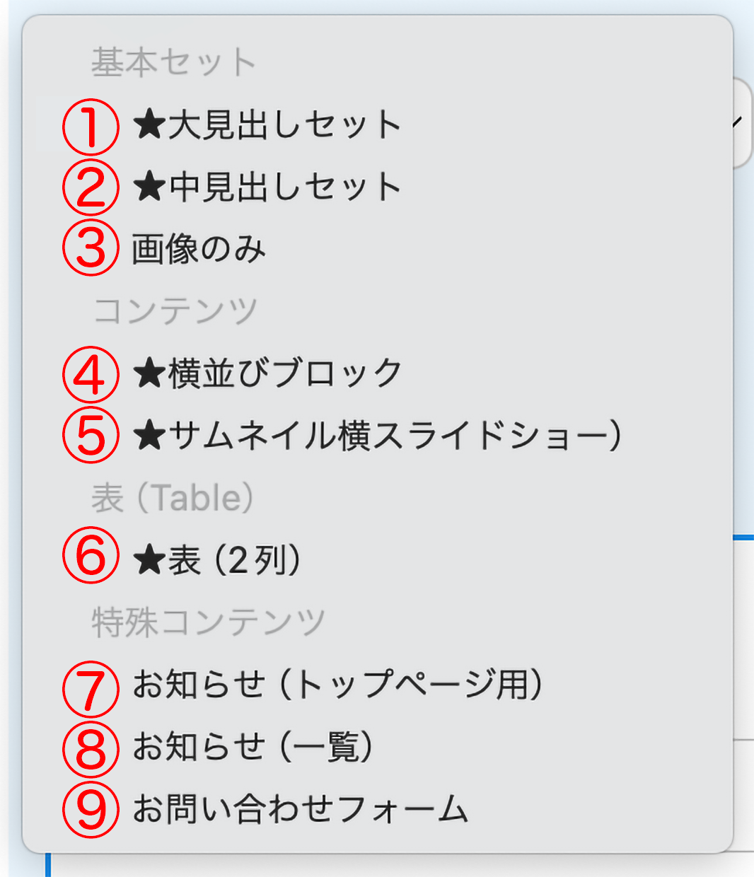 管理ページの「ページ編集」で選べるパーツ一覧です。テンプレートにより、使えるパーツは異なります。