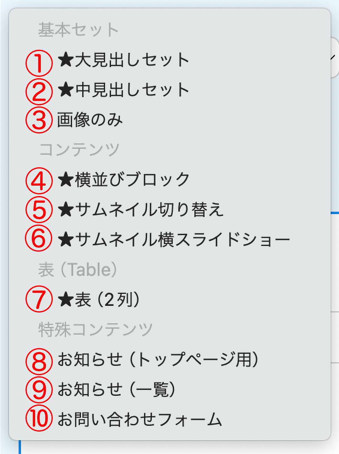 管理ページの「ページ編集」で選べるパーツ一覧です。テンプレートにより、使えるパーツは異なります。