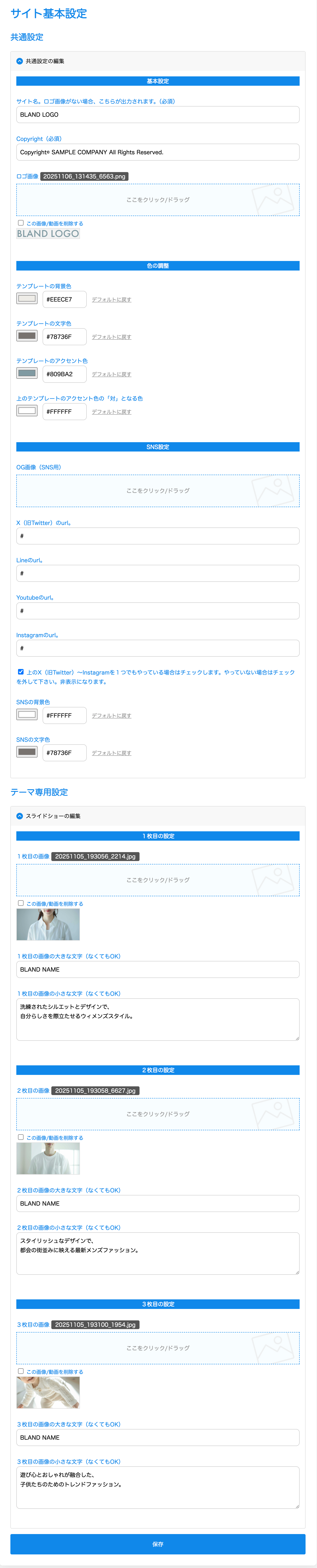 ↓「サイト基本設定」ページです。ロゴやメイン画像はここで設定します。