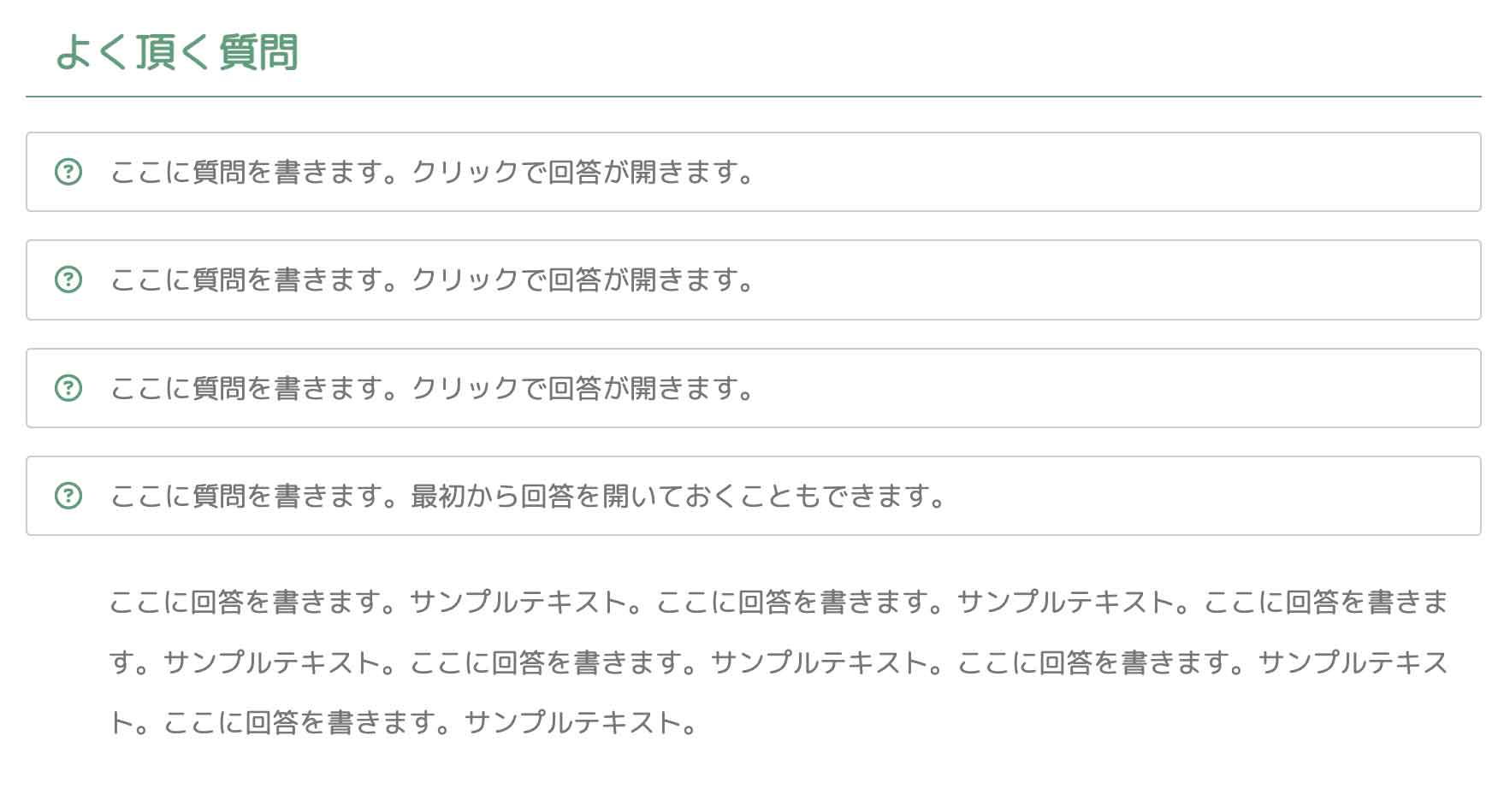「ブロックの開閉操作」の設定を「開閉式にする」にした場合、ここの質問をクリックする事で回答が開きます。