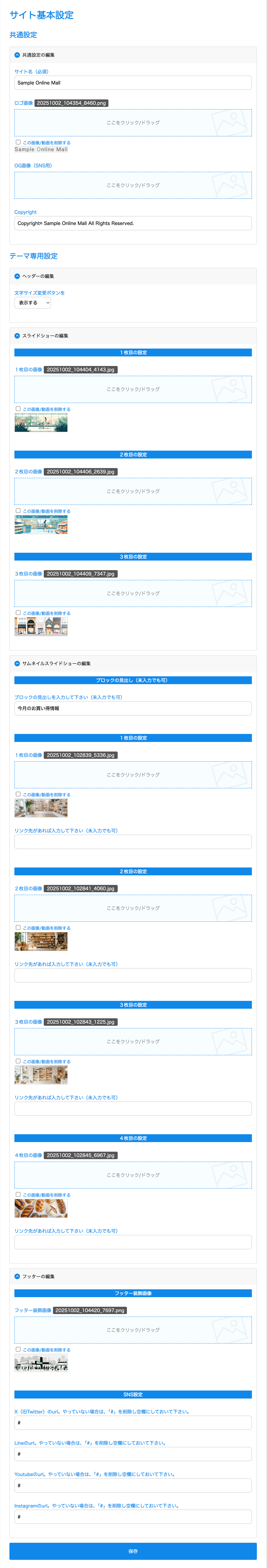 ↓「サイト基本設定」ページです。ロゴやメイン画像はここで設定します。