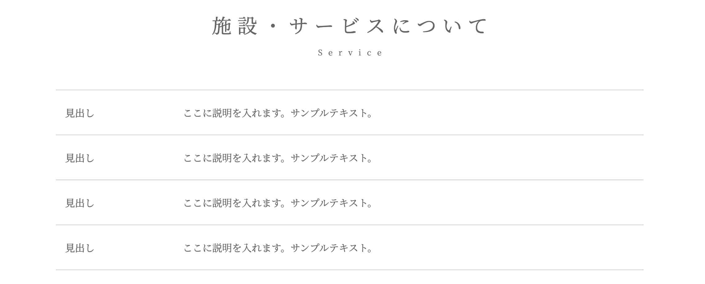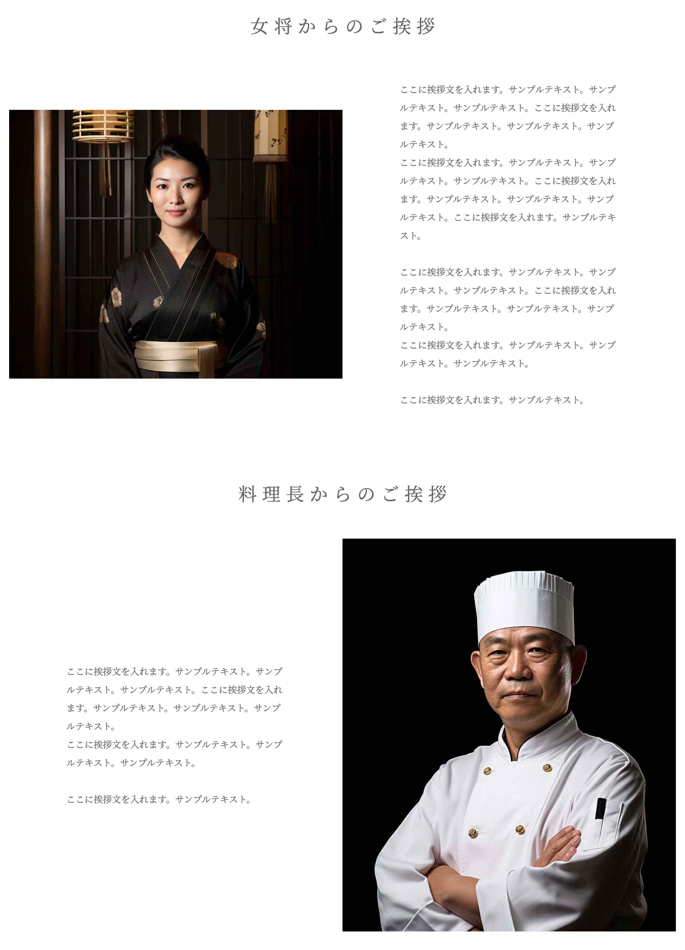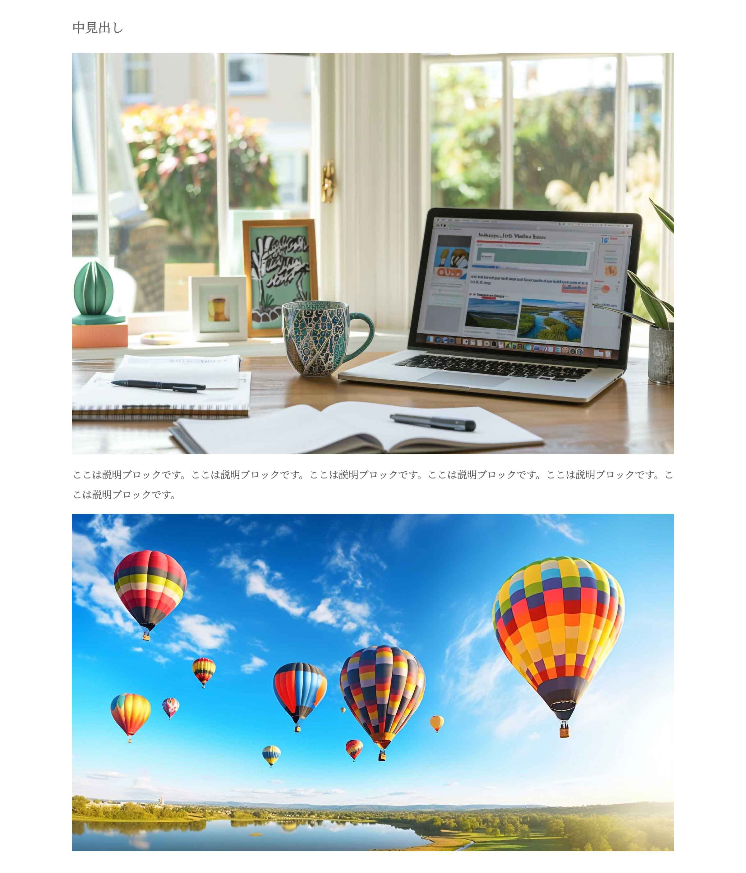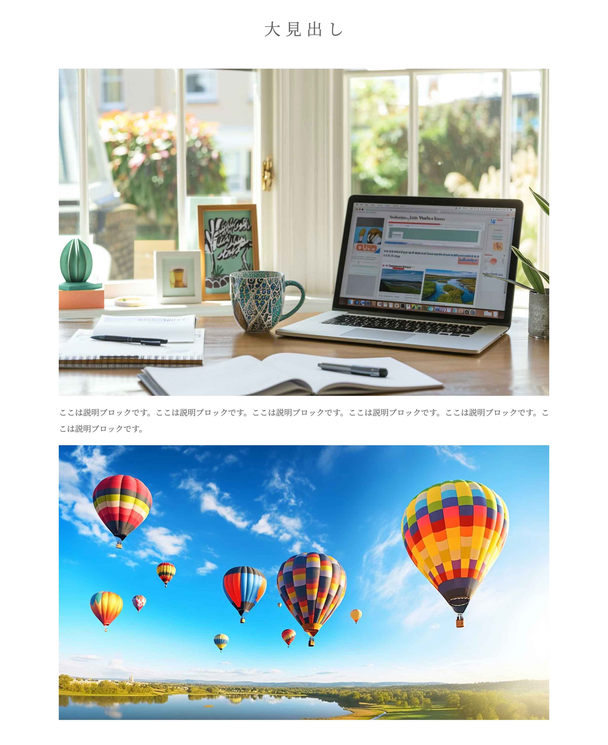 以下はデモの「ご挨拶」ページ冒頭の見出しに使用している例です。この場合は、説明の前・後に入れる画像と説明は使っておらず、見出し専用に使っています。