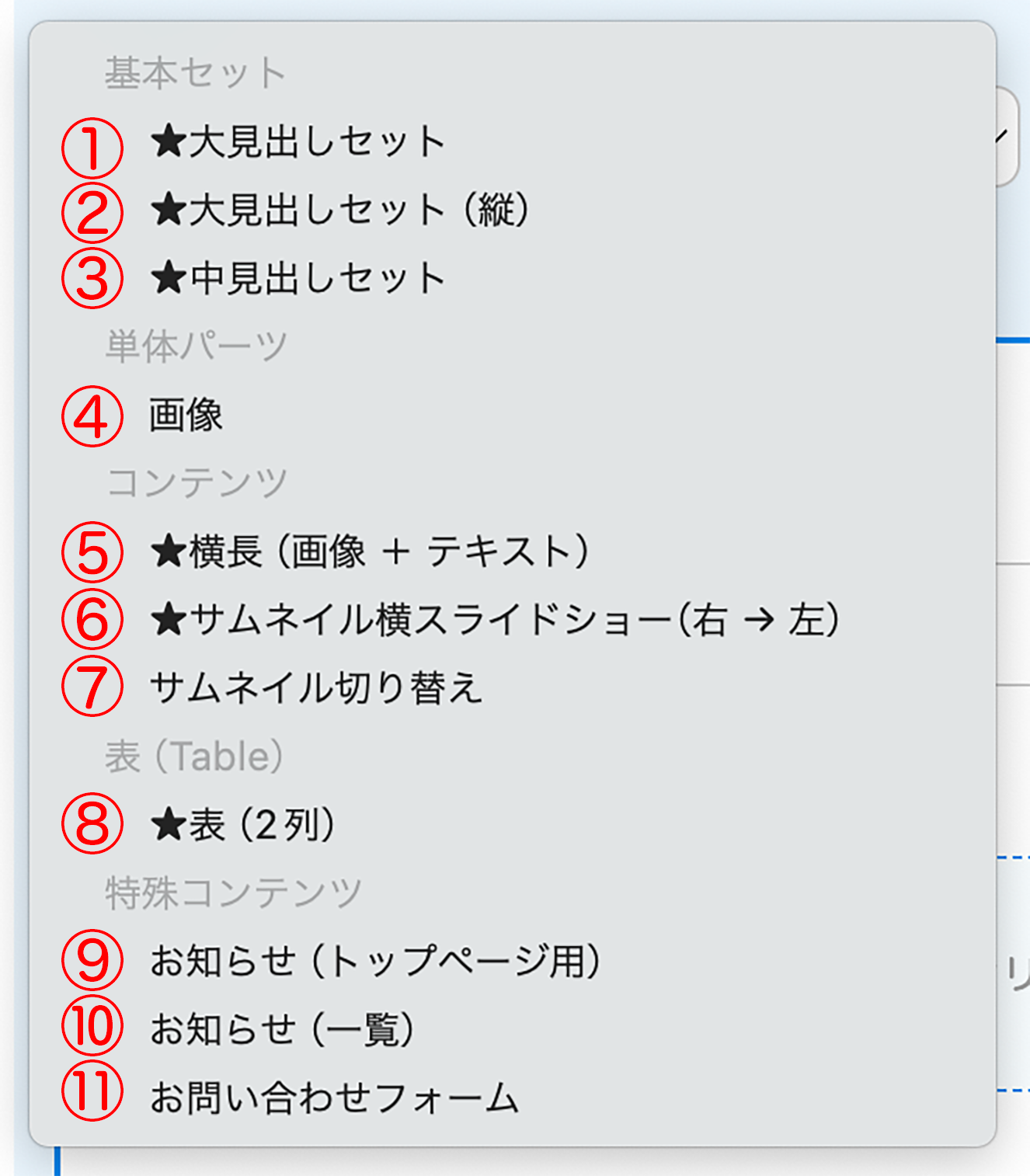 管理ページの「ページ編集」で選べるパーツ一覧です。テンプレートにより、使えるパーツは異なります。